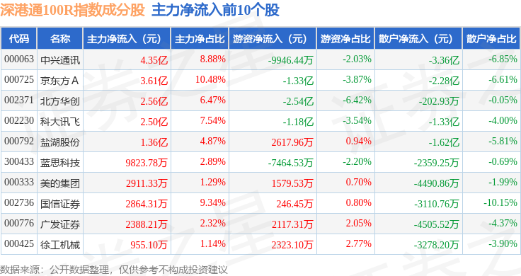 资金流向方面,深港通100R(483007)指数成份股当日主力资金净流出合计81.27亿元,游资资金净流入合计37.28亿元,散户资金净流入合计43.99亿元。成份股资金流向详情见下表: