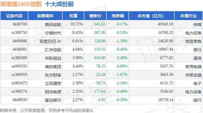 证券之星消息,12月31日,深港通100R(483007)指数报收于9124.17点,跌0.95%,成交1766.96亿元,换手率0.4%。当日该指数成份股中,上涨的有17家,三花智控以5.35%的涨幅领涨,下跌的有81家,阳光电源以4.48%的跌幅领跌。