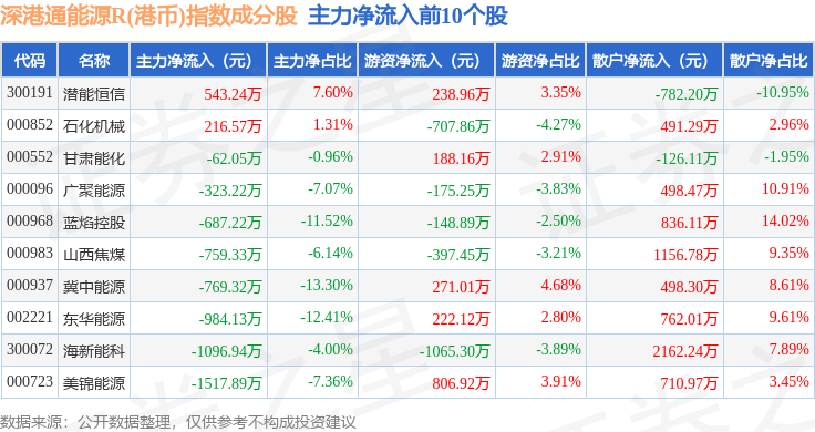 资金流向方面,深港通能源R(港币)(483014)指数成份股当日主力资金净流出合计3.09亿元,游资资金净流出合计3511.17万元,散户资金净流入合计3.44亿元。成份股资金流向详情见下表: