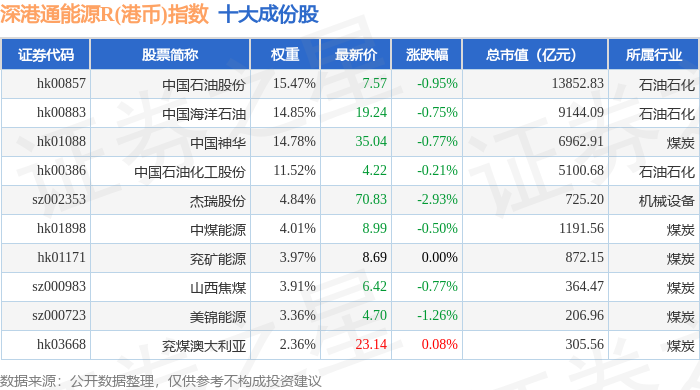 深港通能源R(港币)(483014)指数十大成份股详情如下: