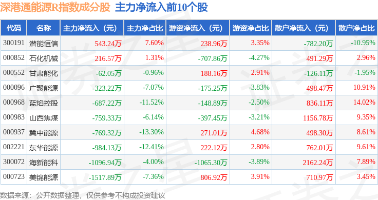 资金流向方面,深港通能源R(483013)指数成份股当日主力资金净流出合计3.09亿元,游资资金净流出合计3511.17万元,散户资金净流入合计3.44亿元。成份股资金流向详情见下表: