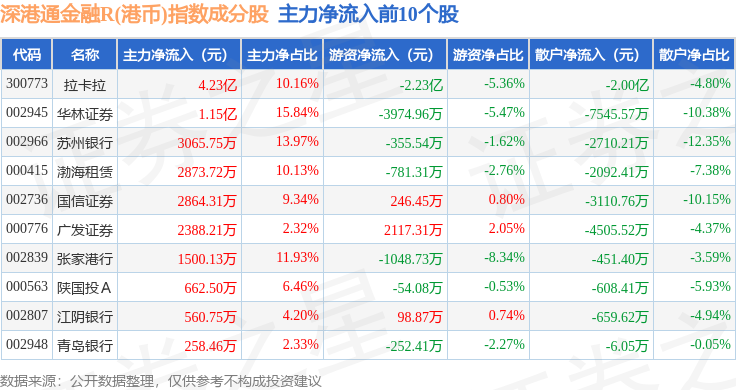 资金流向方面,深港通金融R(港币)(483026)指数成份股当日主力资金净流出合计4.33亿元,游资资金净流入合计1.16亿元,散户资金净流入合计3.16亿元。成份股资金流向详情见下表:
