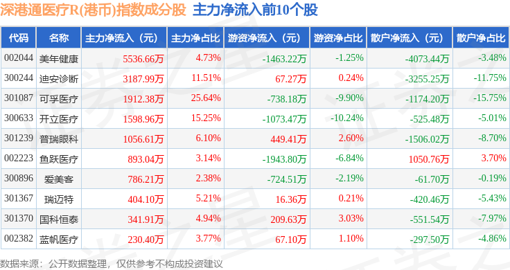 资金流向方面,深港通医疗R(港币)(483036)指数成份股当日主力资金净流出合计5.39亿元,游资资金净流入合计9257.14万元,散户资金净流入合计4.47亿元。成份股资金流向详情见下表: