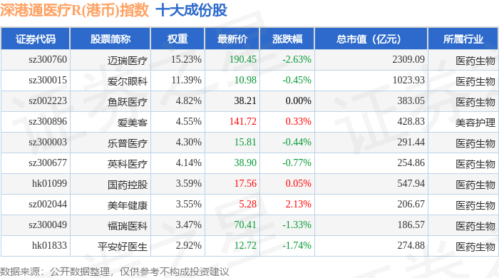 深港通医疗R(港币)(483036)指数十大成份股详情如下: