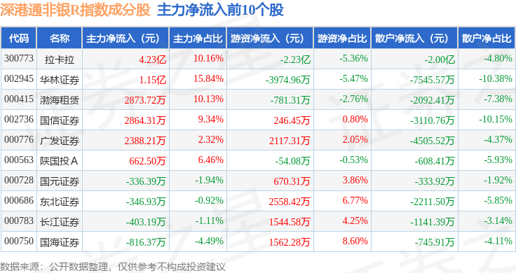 资金流向方面,深港通非银R(483053)指数成份股当日主力资金净流出合计2.61亿元,游资资金净流入合计1.15亿元,散户资金净流入合计1.46亿元。成份股资金流向详情见下表: