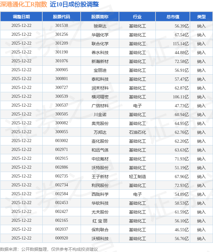 近10日内深港通化工R(483063)指数成份股做了调整,新纳入了25只股票。