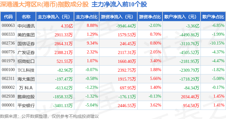 资金流向方面,深港通大湾区R(港币)(483090)指数成份股当日主力资金净流出合计34.81亿元,游资资金净流入合计10.37亿元,散户资金净流入合计24.44亿元。成份股资金流向详情见下表: