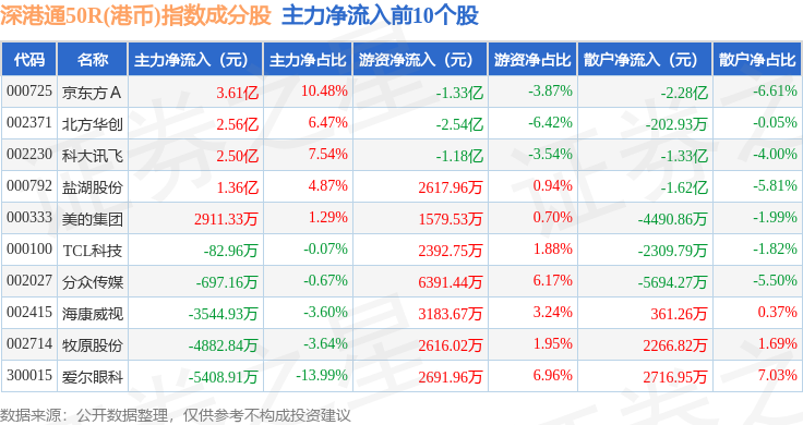 资金流向方面,深港通50R(港币)(483092)指数成份股当日主力资金净流出合计60.9亿元,游资资金净流入合计26.12亿元,散户资金净流入合计34.78亿元。成份股资金流向详情见下表:
