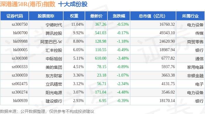 深港通50R(港币)(483092)指数十大成份股详情如下: