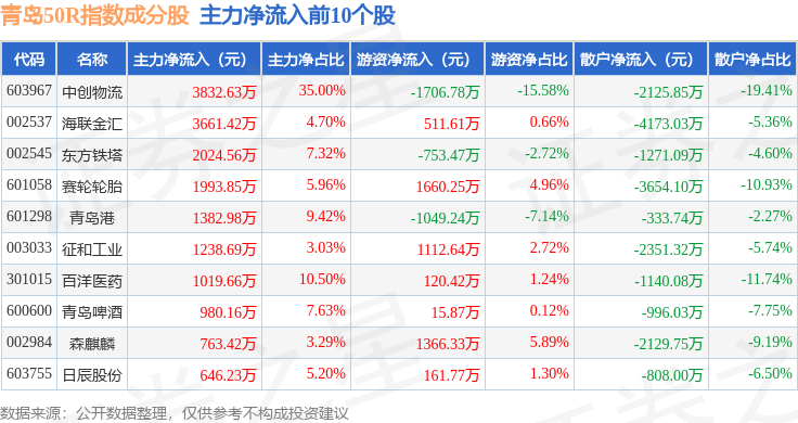 资金流向方面,青岛50R(489011)指数成份股当日主力资金净流出合计3.03亿元,游资资金净流入合计1.91亿元,散户资金净流入合计1.12亿元。成份股资金流向详情见下表: