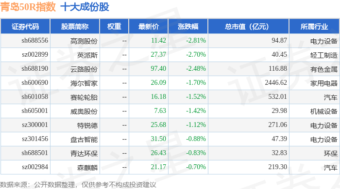 青岛50R(489011)指数十大成份股详情如下: