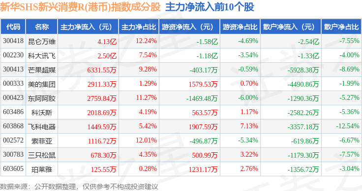 资金流向方面,新华SHS新兴消费R(港币)(489007)指数成份股当日主力资金净流出合计5.89亿元,游资资金净流入合计1.71亿元,散户资金净流入合计4.18亿元。成份股资金流向详情见下表:
