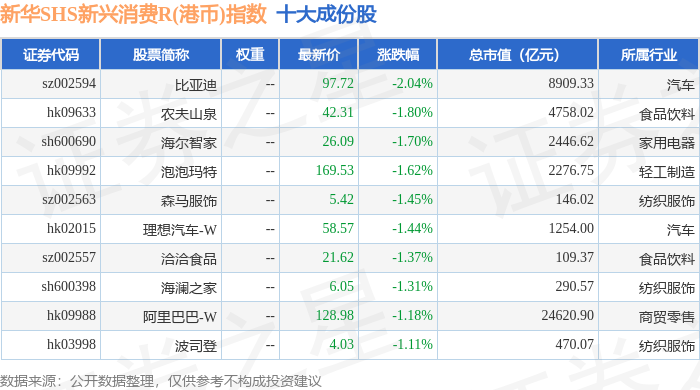 新华SHS新兴消费R(港币)(489007)指数十大成份股详情如下: