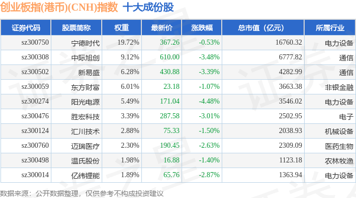 创业板指(港币)(CNH)(970006)指数十大成份股详情如下: