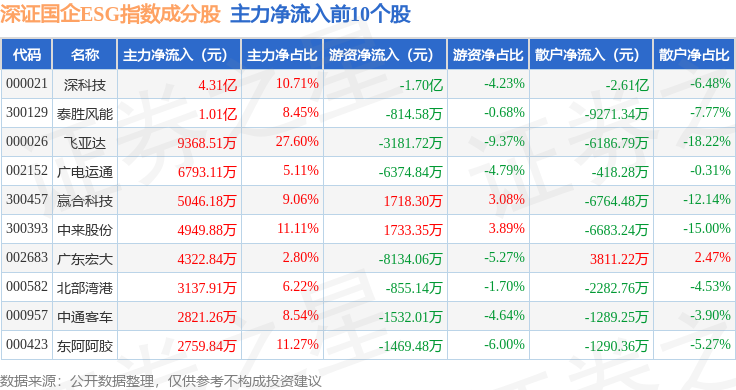 资金流向方面,深证国企ESG(970055)指数成份股当日主力资金净流出合计7.36亿元,游资资金净流入合计4177.47万元,散户资金净流入合计6.94亿元。成份股资金流向详情见下表: