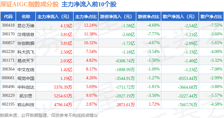 资金流向方面,深证AIGC(970075)指数成份股当日主力资金净流入合计8.89亿元,游资资金净流出合计4.55亿元,散户资金净流出合计4.34亿元。成份股资金流向详情见下表: