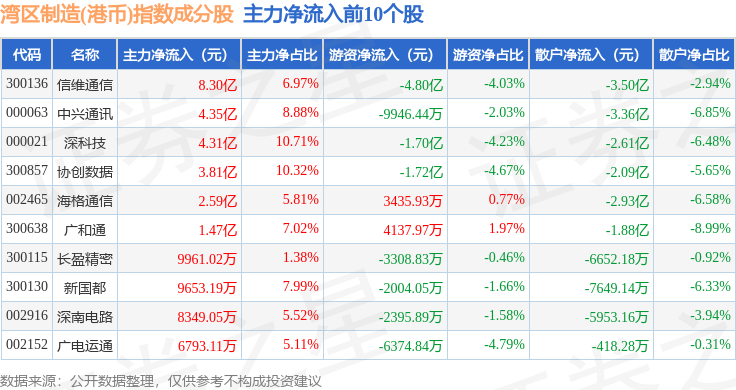 资金流向方面,湾区制造(港币)(980010)指数成份股当日主力资金净流出合计49.72亿元,游资资金净流入合计6.91亿元,散户资金净流入合计42.82亿元。成份股资金流向详情见下表: