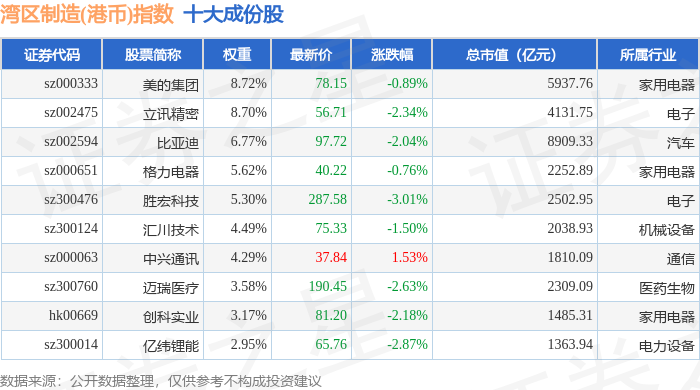 湾区制造(港币)(980010)指数十大成份股详情如下:
