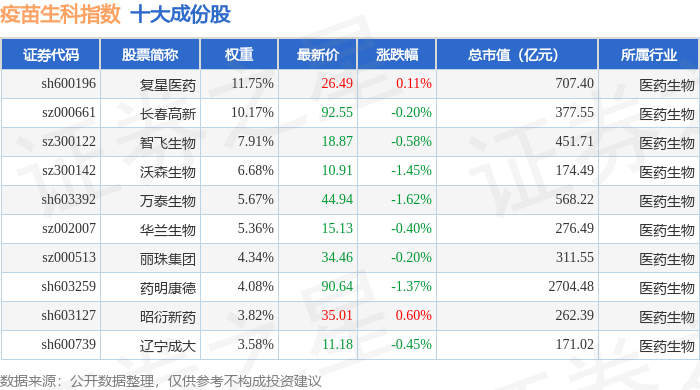 疫苗生科(980015)指数十大成份股详情如下: