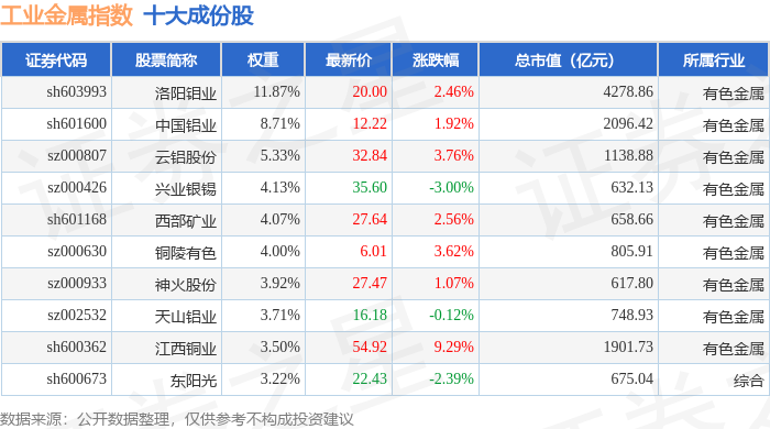 资金流向方面,工业金属(980043)指数成份股当日主力资金净流出合计8.09亿元,游资资金净流出合计2.17亿元,散户资金净流入合计10.25亿元。成份股资金流向详情见下表: