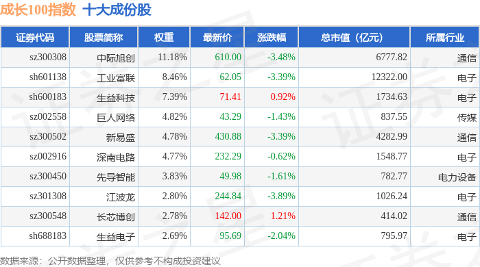 成长100(980080)指数十大成份股详情如下: