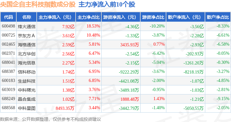 资金流向方面,央国企自主科技(980083)指数成份股当日主力资金净流入合计9.85亿元,游资资金净流出合计6.85亿元,散户资金净流出合计3.0亿元。成份股资金流向详情见下表: