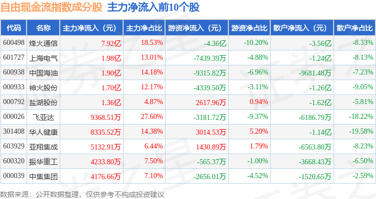 资金流向方面,自由现金流(980092)指数成份股当日主力资金净流入合计3.98亿元,游资资金净流出合计4139.3万元,散户资金净流出合计3.57亿元。成份股资金流向详情见下表:
