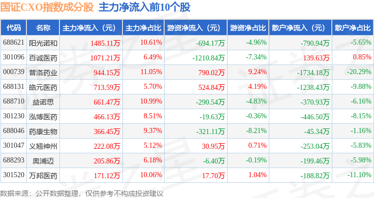资金流向方面,国证CXO(980120)指数成份股当日主力资金净流出合计6.51亿元,游资资金净流入合计3.14亿元,散户资金净流入合计3.37亿元。成份股资金流向详情见下表: