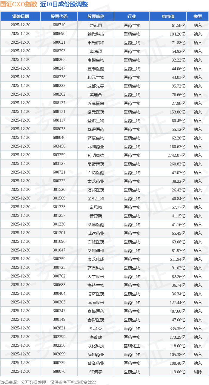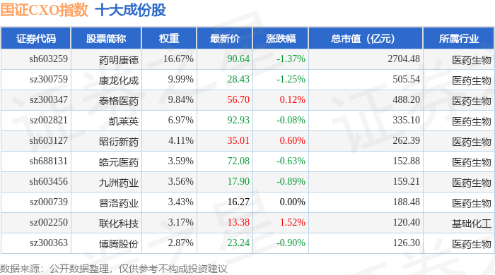 国证CXO(980120)指数十大成份股详情如下: