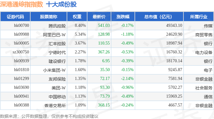 证券之星消息,12月31日,深港通综指(983005)指数报收于6396.02点,跌0.52%,成交11291.44亿元,换手率1.39%。当日该指数成份股中,上涨的有938家,蓝色光标以20.0%的涨幅领涨,下跌的有1259家,赛微电子以9.96%的跌幅领跌。