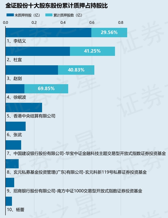 截止本公告日,股东李结义已累计质押股份2500.0万股,占其持股总数的29.56%,股东杜宣已累计质押股份3140.0万股,占其持股总数的41.25%,股东赵剑已累计质押股份2523.0万股,占其持股总数的40.83%,股东徐岷波已累计质押股份3043.0万股,占其持股总数的69.85%。本次质押后金证股份十大股东的累计质押股份占持股比例(占持股比例的计算以公司最新一期财务报表公布的十大股东的持股总数为基准)见下图:
