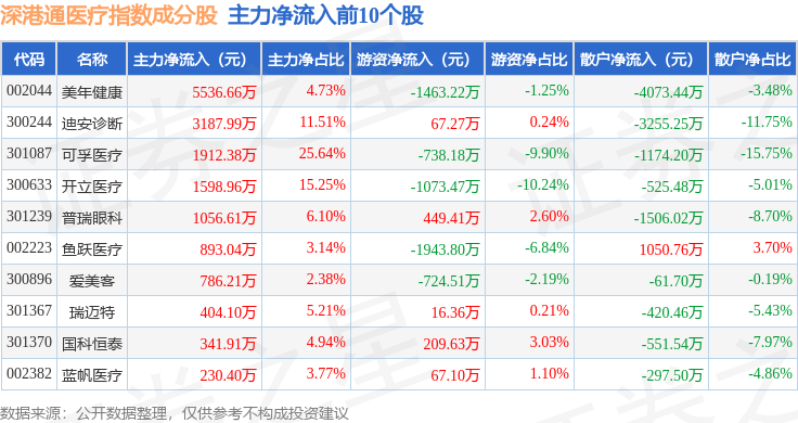 资金流向方面,深港通医疗(983035)指数成份股当日主力资金净流出合计5.39亿元,游资资金净流入合计9257.14万元,散户资金净流入合计4.47亿元。成份股资金流向详情见下表: