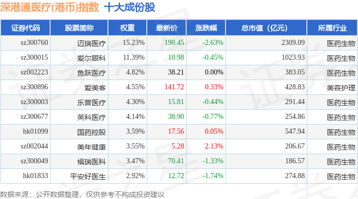 深港通医疗(港币)(983036)指数十大成份股详情如下: