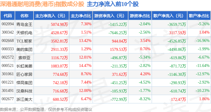 资金流向方面,深港通耐用消费(港币)(983050)指数成份股当日主力资金净流出合计11.21亿元,游资资金净流入合计3.89亿元,散户资金净流入合计7.32亿元。成份股资金流向详情见下表:
