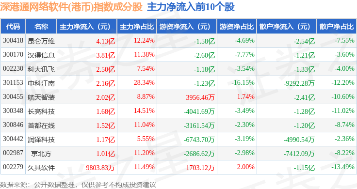 资金流向方面,深港通网络软件(港币)(983048)指数成份股当日主力资金净流入合计18.12亿元,游资资金净流出合计9.62亿元,散户资金净流出合计8.5亿元。成份股资金流向详情见下表: