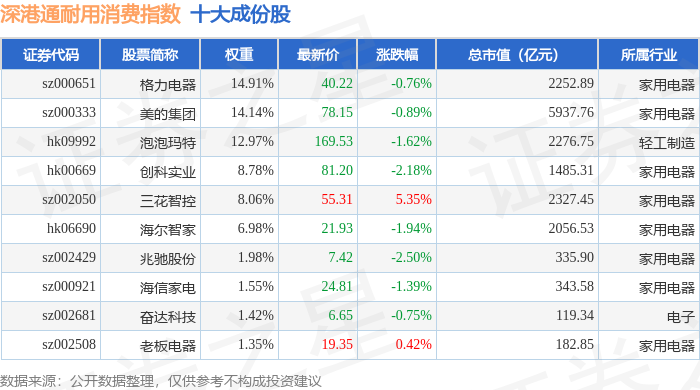 深港通耐用消费(983049)指数十大成份股详情如下: