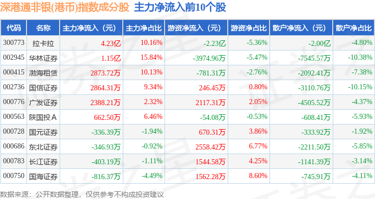 资金流向方面,深港通非银(港币)(983054)指数成份股当日主力资金净流出合计2.61亿元,游资资金净流入合计1.15亿元,散户资金净流入合计1.46亿元。成份股资金流向详情见下表: