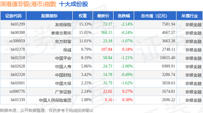 深港通非银(港币)(983054)指数十大成份股详情如下: