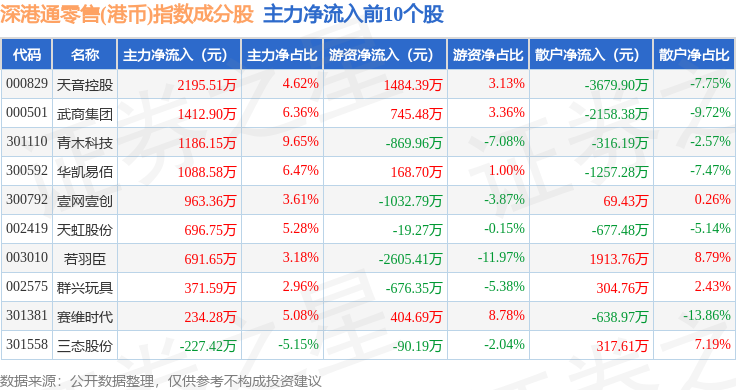 资金流向方面,深港通零售(港币)(983074)指数成份股当日主力资金净流出合计2.84亿元,游资资金净流入合计1586.22万元,散户资金净流入合计2.68亿元。成份股资金流向详情见下表: