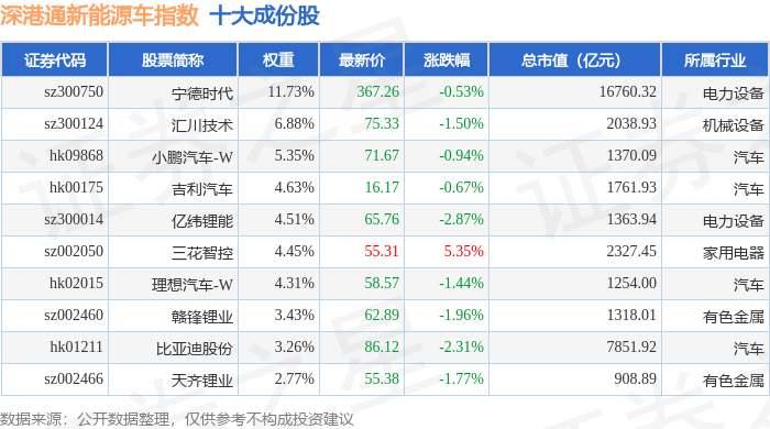 证券之星消息,12月31日,深港通新能源车(983087)指数报收于6067.54点,跌0.8%,成交914.76亿元,换手率2.32%。当日该指数成份股中,上涨的有10家,三花智控以5.35%的涨幅领涨,下跌的有39家,科达利以4.0%的跌幅领跌。