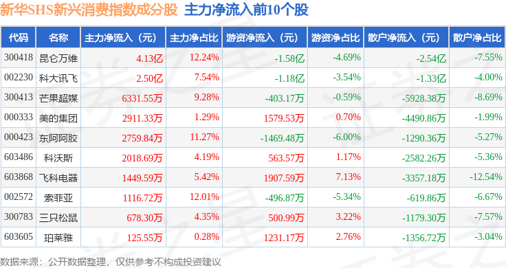 资金流向方面,新华SHS新兴消费(989006)指数成份股当日主力资金净流出合计5.89亿元,游资资金净流入合计1.71亿元,散户资金净流入合计4.18亿元。成份股资金流向详情见下表: