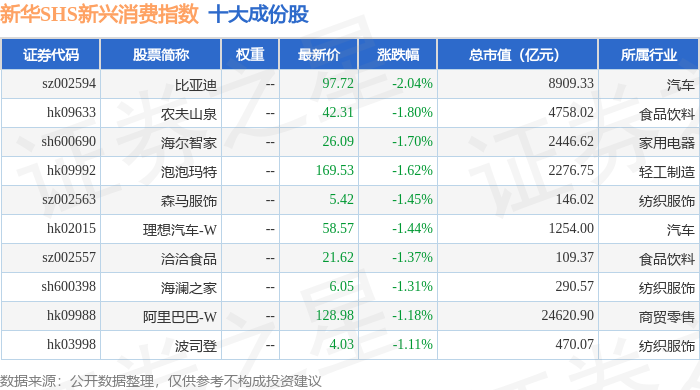 新华SHS新兴消费(989006)指数十大成份股详情如下: