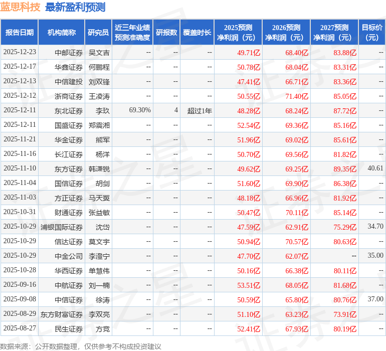 证券之星数据中心根据近三年发布的研报数据计算,东北证券李玖研究员团队对该股研究较为深入,近三年预测准确度均值为69.3%,其预测2025年度归属净利润为盈利48.28亿,根据现价换算的预测PE为33.26。