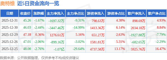 证券之星消息,截至2025年12月31日收盘,奥特维(688516)报收于45.26元,下跌1.67%,换手率1.27%,成交量4.0万手,成交额1.82亿元。