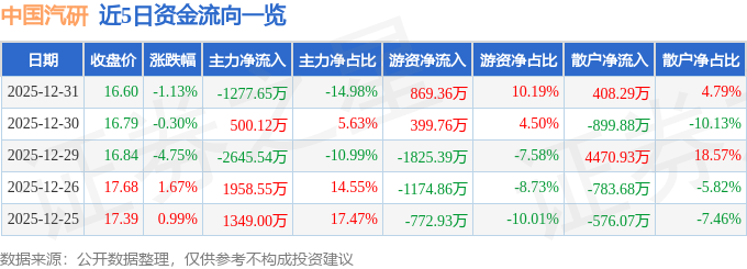证券之星消息,截至2025年12月31日收盘,中国汽研(601965)报收于16.6元,下跌1.13%,换手率0.51%,成交量5.13万手,成交额8531.2万元。