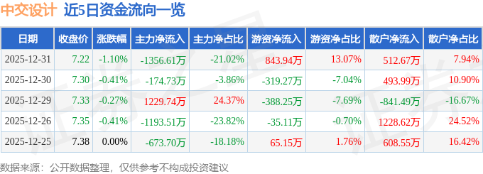证券之星消息,截至2025年12月31日收盘,中交设计(600720)报收于7.22元,下跌1.1%,换手率0.88%,成交量8.9万手,成交额6455.12万元。