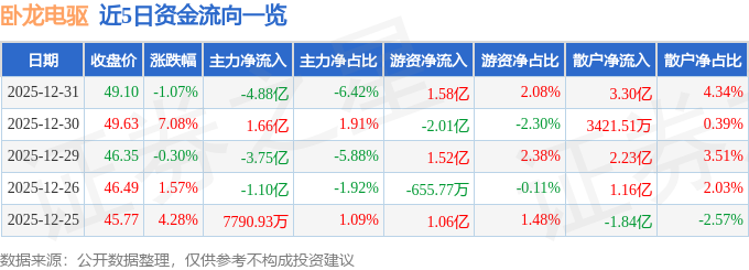 证券之星消息,截至2025年12月31日收盘,卧龙电驱(600580)报收于49.1元,下跌1.07%,换手率9.83%,成交量153.07万手,成交额75.91亿元。