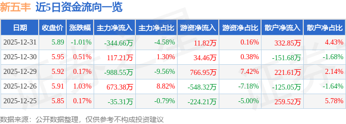 证券之星消息,截至2025年12月31日收盘,新五丰(600975)报收于5.89元,下跌1.01%,换手率1.26%,成交量12.78万手,成交额7520.33万元。