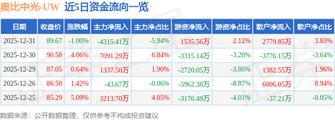 证券之星消息,截至2025年12月31日收盘,奥比中光(688322)报收于89.67元,下跌1.0%,换手率2.76%,成交量8.08万手,成交额7.26亿元。