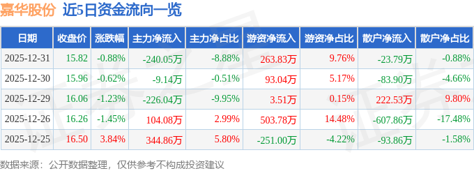 证券之星消息,截至2025年12月31日收盘,嘉华股份(603182)报收于15.82元,下跌0.88%,换手率1.04%,成交量1.71万手,成交额2701.9万元。